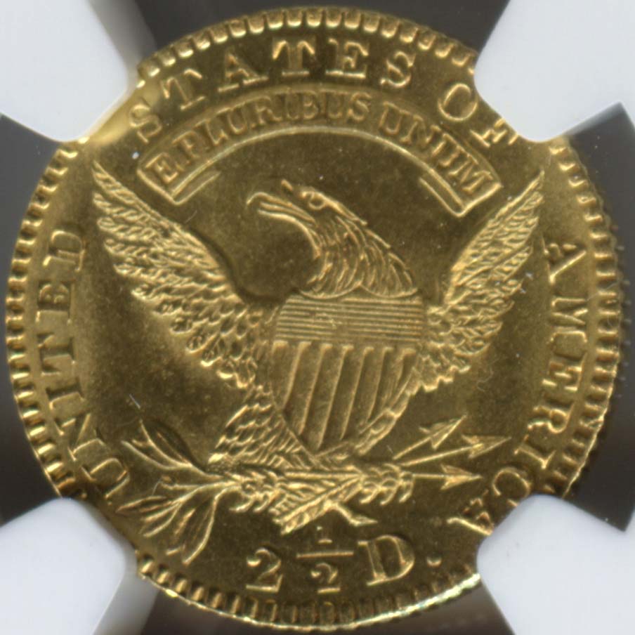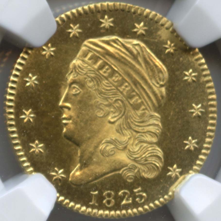 This 1825 Capped Bust Gold Quarter Eagle (large size) was authenticated and certified MS 66 by NGC. It is considered the second finest known.