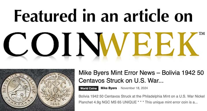 Wartime Mint Errors from 1942-1945 are among the most coveted and sought after by mint error collectors. Obviously the most famous are the 1943 copper Lincoln Cents that sell for $300,000 and the 1944 steel Lincoln Cents that sell for $50,000 to $100,000. Even a 1943 Lincoln cent struck on a Curacao 25 Centstukken planchet sold in a Heritage auction for $31,200. There are only a handful of world coins struck on U.S. planchets known during this wartime period. This Bolivia 50 Centavos struck on a U.S. Silver Wartime Nickel Planchet is unique.