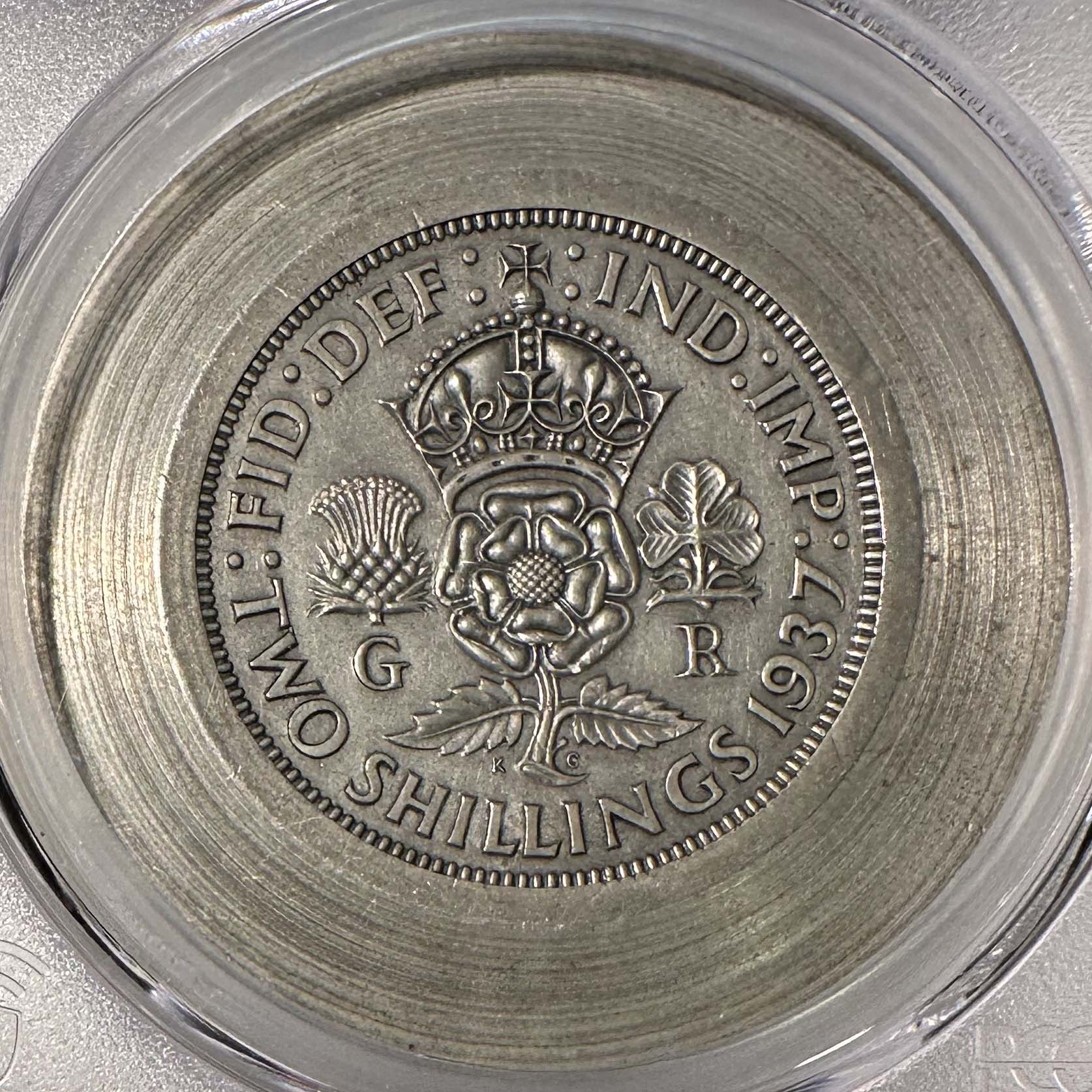 This is a historic numismatic treasure! It is a unique 1937 Great Britain Florin (Two Shillings) reverse die trial, which has been authenticated and certified by PCGS. Although graded MS 63, it is virtually
