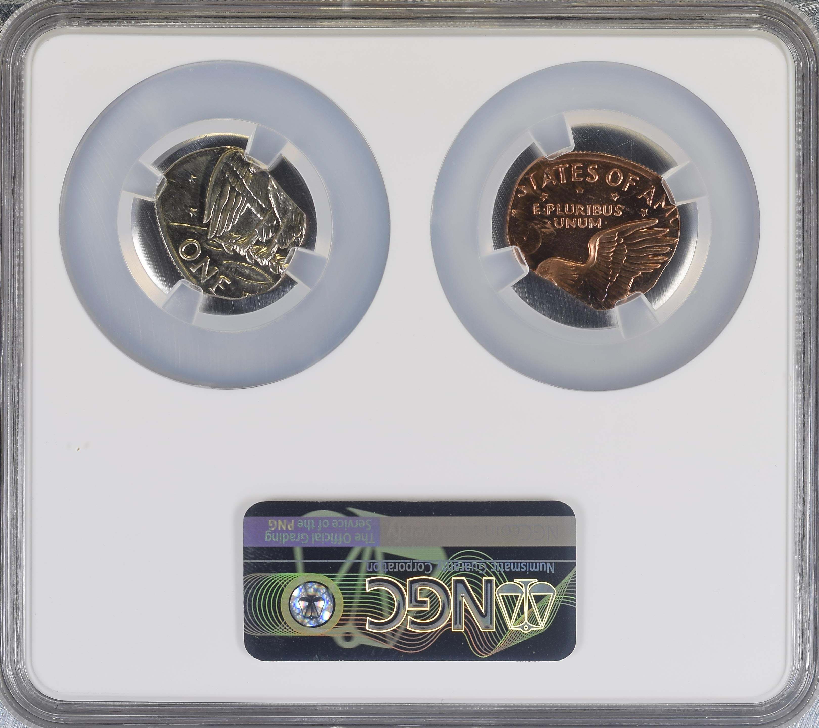 This is an amazing off-metal mated pair of U.S. proof coinage that combines two different off-metals. This mated pair is the original discovery that was featured on the cover of Mint Error News Magazine and in CoinWeek. A clad dime planchet and a copper cent planchet were intentionally placed in the collar at the same time and were struck by both the obverse and reverse Ike Dollar proof dies. The placement of Eisenhower's head on the obverse and the eagle on the reverse is perfectly positioned.