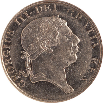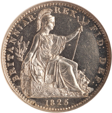 This highly unusual pattern coin dates from the late 1820’s, when the British Royal Mint was exploring the use of platinum for coinage. The hardness of the metal proved difficult for striking, and thus some details are not full struck up. This is most apparent on the obverse legend, which shows some softness. Whether because of the technical challenges or some other reason, no platinum was used for coinage in Great Britain until 2007, when it was introduced as part of the Britannia bullion series.