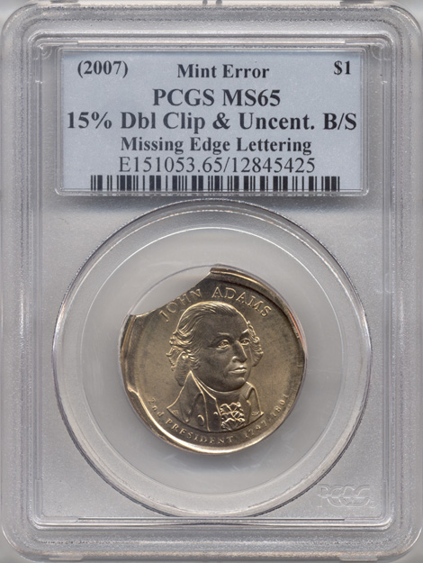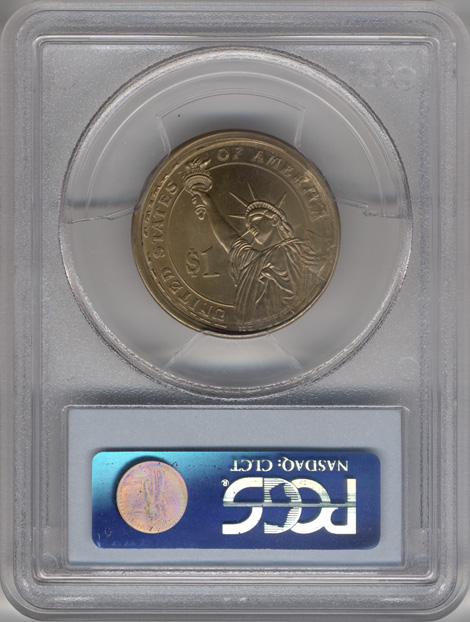 Other major mint errors in the Presidential Dollar series are very scarce. Only two or three off-centers have been reported and only a handful of double struck coins have surfaced. Several Presidential Dollars have been discovered missing either an obverse or reverse clad layer. A few of these Missing Clad Layers are also missing the Edge Lettering. To date, three Proof Presidential Dollars have been certified by NGC that were stuck on elliptical planchets. PCGS has certified a few with clips and a few that are broadstruck. Some of the major mint errors on Presidential Dollars are featured here.