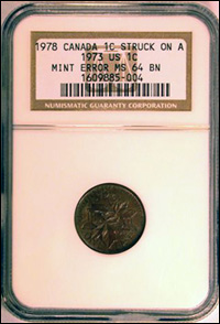 This recent discovery is a major mint error involving Mints from the U.S. and Canada. It’s a 1973 U.S. Cent that was overstruck by 1978 Canadian Cent Dies! Lincoln’s portrait and the date 1973 is clearly visible on the obverse, and the Lincoln Memorial is very visible on the reverse.