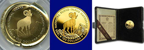 Coin #1 is a Canadian Gold $100 Reverse Die Cap. The Royal Canadian Mint issued this coin in 1985. It is the $100 National Park Commemorative Coin. The obverse depicts Queen Elizabeth II and the reverse depicts a Rocky Mountain Bighorn sheep.