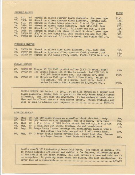 Fred Weinberg recently discovered, in an old and dusty file, one of Mike Byers' price lists on major mint errors from 3 decades ago! It is a blast for error collectors to look at. There are many major errors listed that sold for a fraction of what they bring today. One example is a 1900 Indian Head Cent struck in gold that Mike purchased from the Beck Collection in 1974 for $7,750. Today, this mint error would easily bring $75,000.