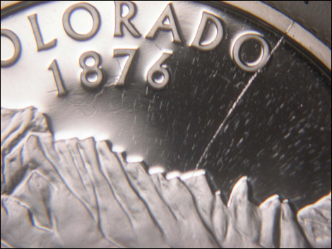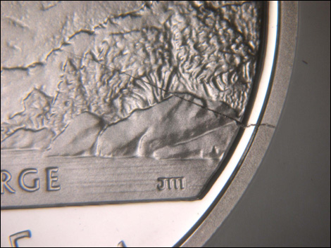 NGC recently identified die cracks on two issues of silver proof States Quarters. The first discovery was on a 2005-S Silver West Virginia Quarter, where a thin crack emerges from the rim at approximately 4:00 and enters the frosted devices. The second error, seen on a 2006-S Silver Colorado Quarter, is slightly more dramatic. It starts at the rim just past 1:00 and runs diagonally through the mirrored field, which makes it readily visible.