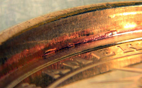 PHOTO #1c: Detail of raised rim or flange of proof 2007-S John Adams $1 struck from horizontally misaligned dies.
