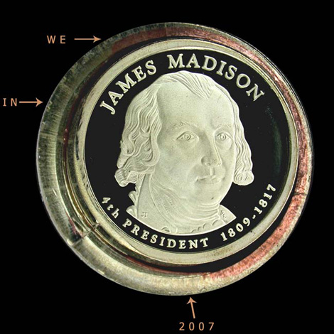 PHOTO #3a: Proof 2007-S James Madison $1 partial collar error, obverse view.