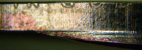 PHOTO #1d: View of edge of proof 2007-S John Adams $1 struck from horizontally misaligned dies, showing wedge-like shape.