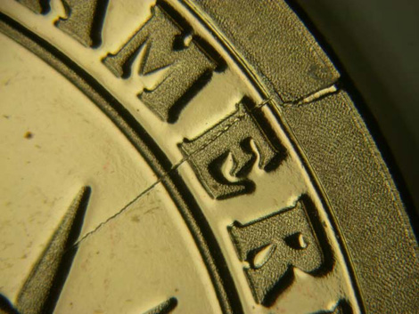 PHOTO #3b: View of edge of proof 2007-S James Madison $1 partial collar error, showing high position of the date, 2007. The raised flange can also be seen at the left hand side of the image.