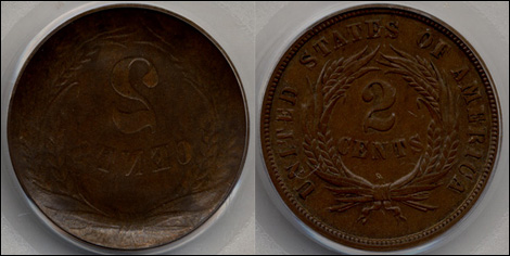 1865 2¢ Deep Obverse Die Cap - Brockage Reverse - PCGS MS 64 RB