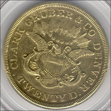 This is a spectacular Clark Gruber and Co. double struck $20 gold piece. Clark Gruber was the most respected and well known financial and banking company in the pioneer and Gold Rush days in Colorado. Clark Gruber and Co. opened a bank and mint in 1860 and became coiners, striking their own gold coins of proper weight. The denominations struck were $2 1/2, $5, $10 and $20. These pieces were accepted as currency since Clark Gruber and Co. was a well known private minting firm with an excellent reputation.