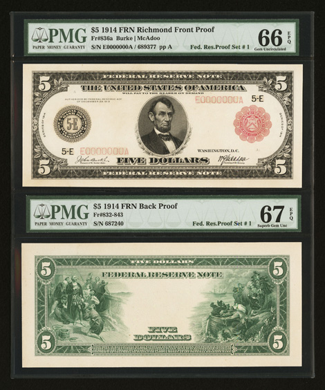 The set consists of ten pieces, a Richmond district front of each of the five denominations along with a back for each of the five denominations. All have been encapsulated in custom holders and graded by PMG, with the grades of each as follows: $5 Front Proof Gem Uncirculated 66 EPQ, $5 Back Proof Superb Gem 67 EPQ, $10 Face Proof Gem Uncirculated 66 EPQ, $10 Back Proof Gem Uncirculated 66 EPQ, $20 Face Proof Gem Uncirculated 66 EPQ, $20 Back Proof Choice Uncirculated 64, $50 Face Proof Superb Gem Uncirculated 67 EPQ, $50 Back Proof Choice Uncirculated 64, $100 Face Proof Gem Uncirculated 66 EPQ, $100 Back Proof Gem Uncirculated 65 EPQ.