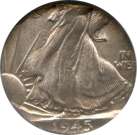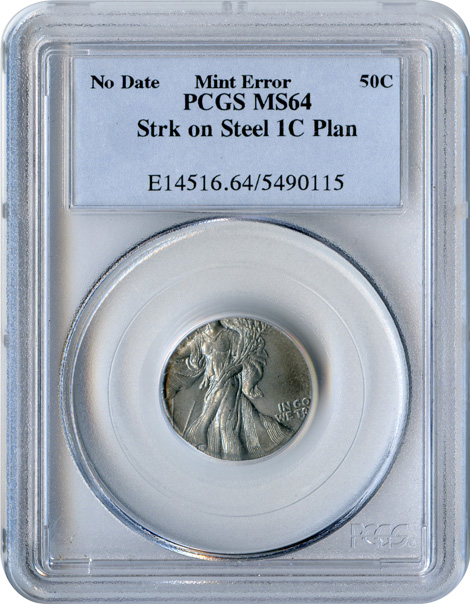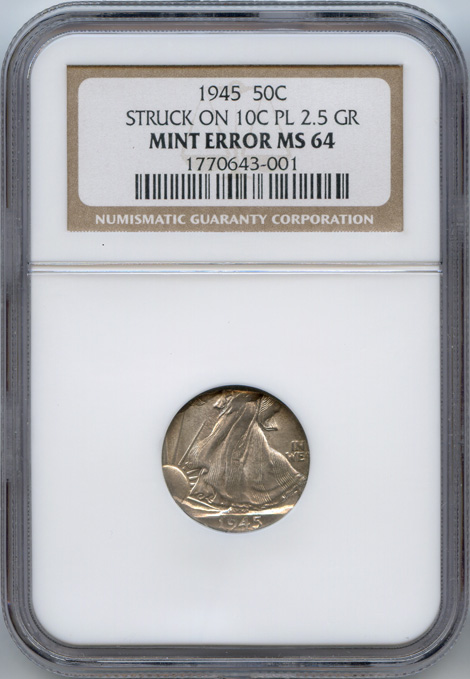 This spectacular 1945 Walking Liberty Half Dollar was struck on a Dime planchet. It was authenticated and certified by NGC and was graded Mint State 64.