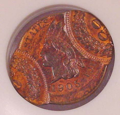 1905 Indian Cent Double Struck. First Strike 10% Off Center at K-8. Second Strike 75% Off Center at K-3.