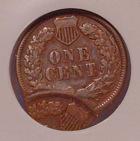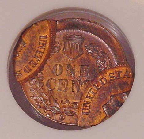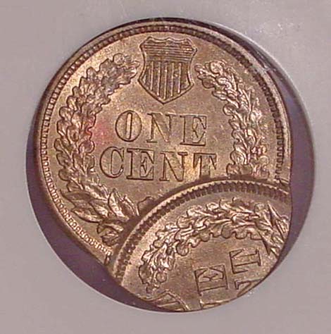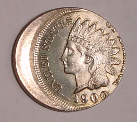 1900 Indian Cent Double Struck. First Strike on Center. Second Strike 90% Off Center at K-10.