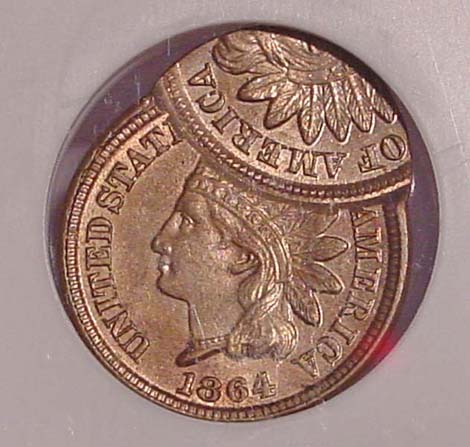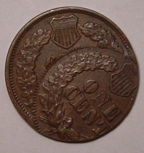 1864 CN Indian Cent Double Struck. First Strike on Center. Second Strike 65% Off-Center at K-1.