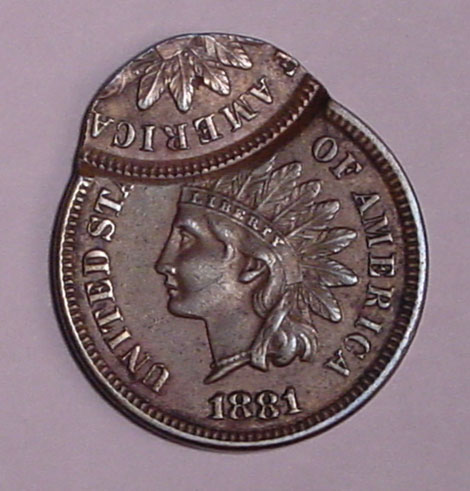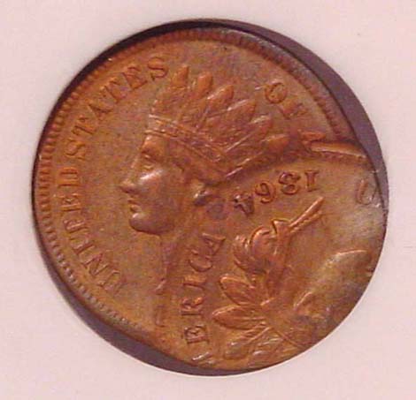 1881 Indian Cent Double Struck. First Strike on Center. Second Strike 75% Off Center at K-12.