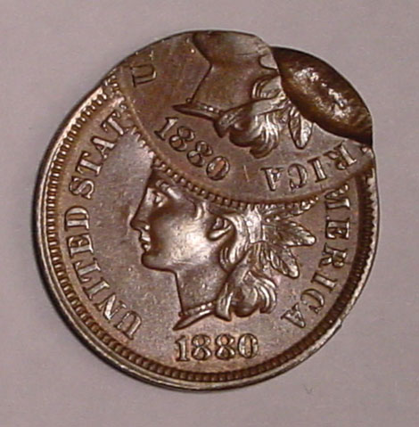 1880 Indian Cent Double Struck. First Strike on Center. Second Strike 55% Off Center at K-1. 5% Indent on the Second Strike.
