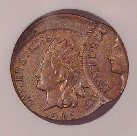 1905 Indian Cent Double Struck Second Strike 5% Off Center at K-12 with a 50% Obverse Indent.