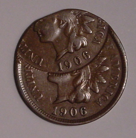 1906 Indian Cent Double Struck. First Strike on Center. Second Strike 45% Off Center at K-11. Two Dates.