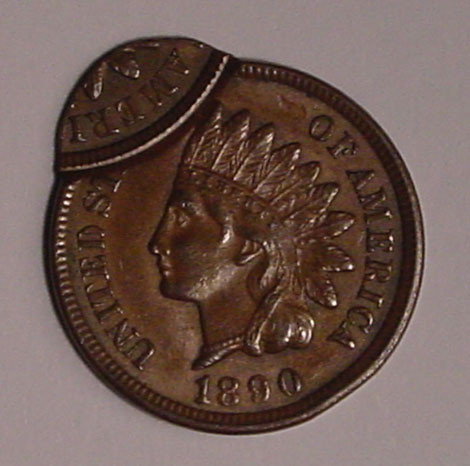 1890 Indian Cent Double Struck. First Strike on Center. Second Strike 85% Off Center at K-11.