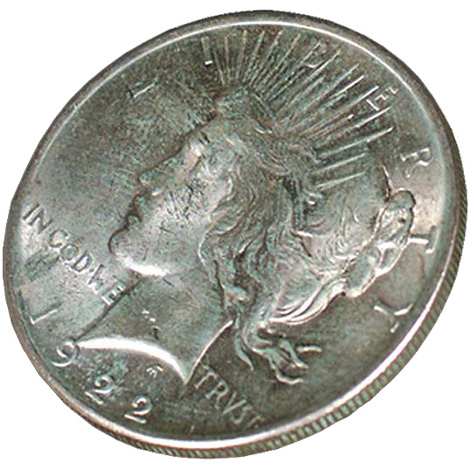 This Peace dollar has a layer of PVC residue that is easily observed. Note the “off” color of light green haze on the coin’s surface.