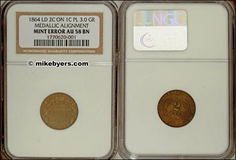 Major mint errors in the 2¢ series are very rare. There are only a handful of 2¢ off-metals known. This one was struck on a planchet intended for an Indian cent. It is well centered, shows much of the date and is almost uncirculated.