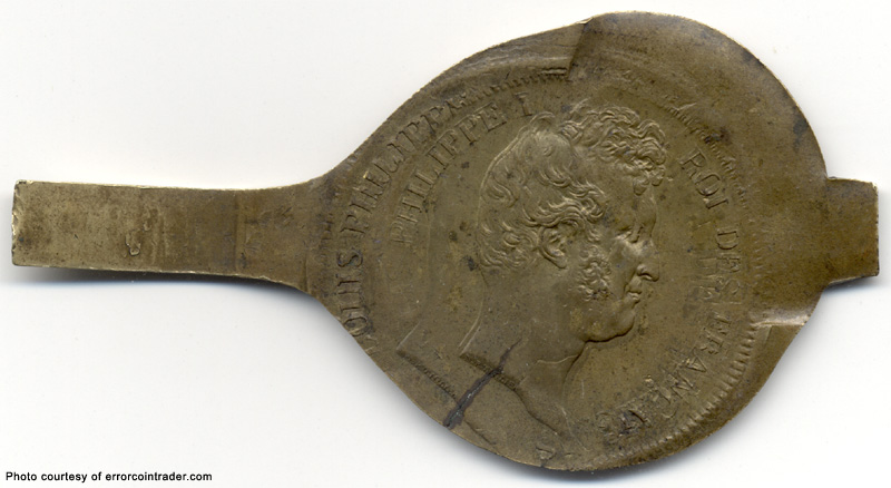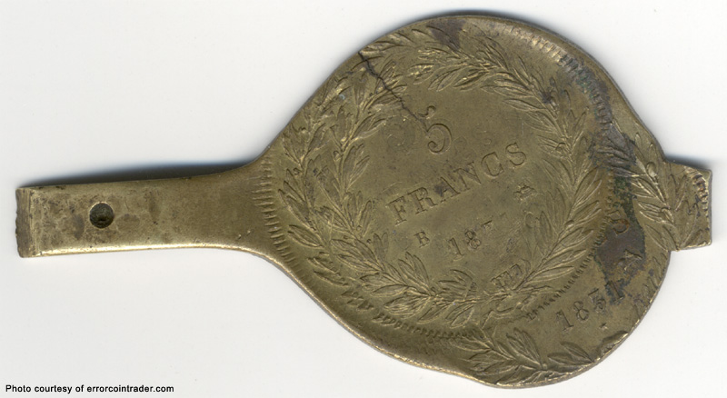 It's a 1831 French 5 Francs. It's DOUBLE STRUCK on a BRASS spoon! Most of the detail from both sides of the strike shows. Part of the handle from the