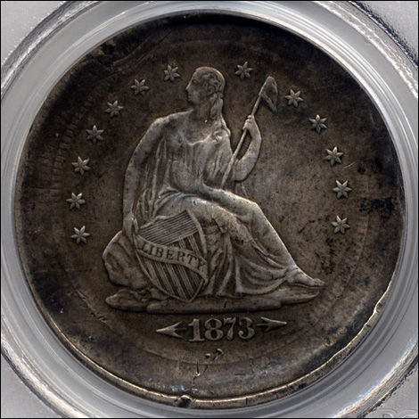 Although described as a broadstruck brockage, this 1873 Seated Half Dollar is actually an obverse die cap. It is the size of a Morgan Dollar. The reverse has a brockage depicting the obverse design. This cap struck so many blanks that the reverse brockage expanded to the size of a dollar.