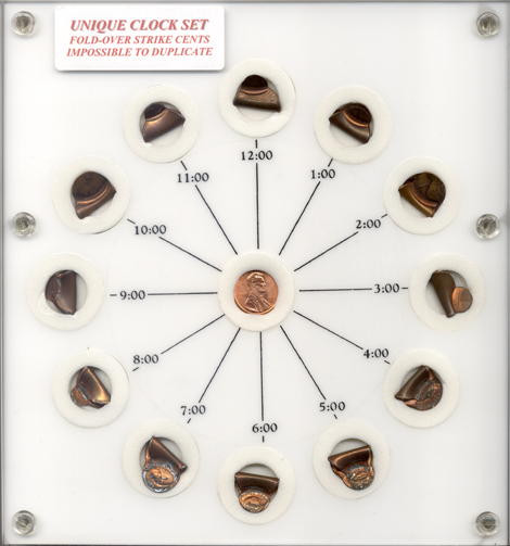 This fold-over clock represents the only known clock of twelve fold-over Cents. Each was struck folded-over in one of the twelve positions. It includes one that is double struck and many that are struck in copper. It is unique and one of the more exciting mint error sets that I have ever handled.