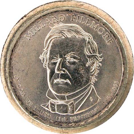 Millard Fillmore dollar, obverse, missing edge lettering.