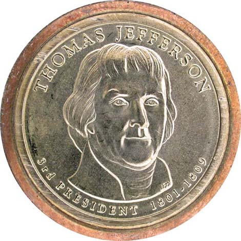 Thomas Jefferson Dollar from Mint Set, obverse, missing edge lettering.
