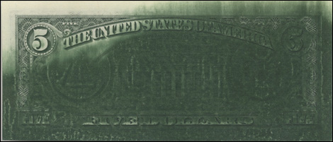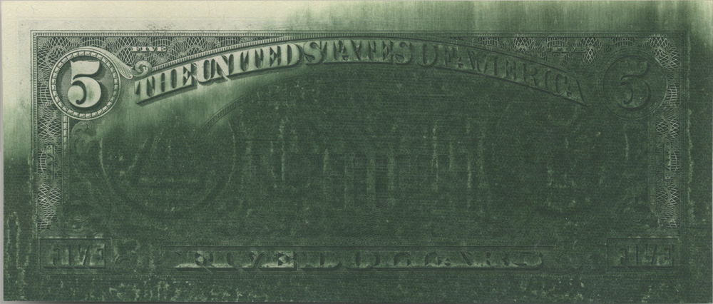 This is a unique double denomination note where the back of a One Dollar denomination was printed over the back of a Five Dollar denomination. The back was printed with a heavy ink smear. This note grades gem crisp uncirculated.