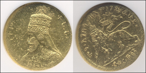 This gold mule is from Ethiopia and is unlisted. Somehow the obverse die which struck (1931) Werks was muled to the reverse of KM-18. The dies were not aligned properly and the reverse die was also rotated. A spectacular and unique major mint error.
