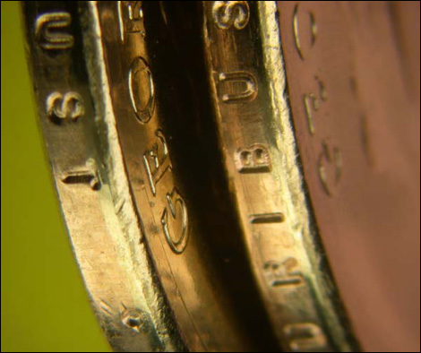 Photo #11b: Weakly lettered edge planchet, top, compared with regular edge lettering on bottom.