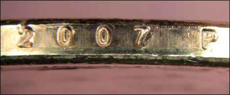 Photo #14b: A close up of the edge showing two sets of edge lettering. Here a portion of the date and mintmark, ‘07 P,’ are seen to overlap with ‘URIBU’ of E PLURIBUS UNUM.