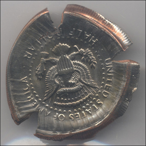 This is the largest Kennedy Half Dollar mint error that I’ve ever seen. It is a multi struck reverse die cap and is larger than a U.S. $1 American Eagle. Somehow this spectacular and dramatic mint error survived.
