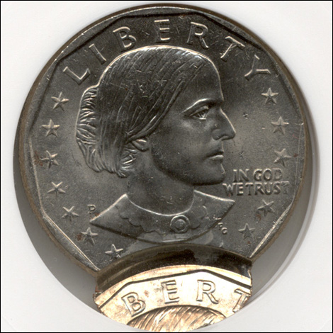 This is one of two known mated pairs of SBA Dollars. This is a double struck SBA Dollar mated to an indented SBA Dollar. It is extremely rare and a very dramatic major mint error.