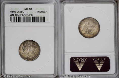 1946-D 25C Washington Quarter--Struck on a Silver Dime Planchet--MS61 ANACS. Wrong planchet or wrong metal errors can take on a variety of forms. This example witnessed a dime planchet that was accidentally fed into the press striking Washington Quarters. Fully lustrous with medium to dark gold toning. There are many different ways to collect error coins, perhaps limited only by the number of different errors, or only by the collector’s imagination. One idea would be to form a type set of coins struck on wrong planchets. A Lincoln Cent on a silver dime planchet in this sale would make a nice companion piece for this example.