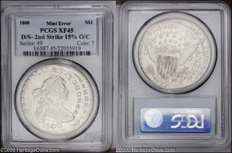1800 $1--Double Struck, Second Strike 15% Off Center--XF45 PCGS. B-15, BB-195, R.4. A moderately scarce variety among 1800 dollars, there are several diagnostics that identify this variant. There is a prominent die crack through the top of the O in OF, a die dot between the R and T of LIBERTY, and several die flaws around TES. However, of much greater importance is the double striking on this coin. This is a true rarity among early dollars and the few pieces that are known are quickly absorbed by collectors when they become available.