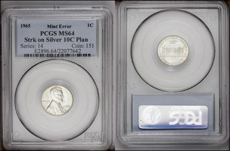 1965 1C Lincoln Cent--Struck on a Silver Dime Planchet--MS64 PCGS.