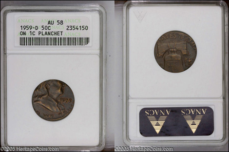 1959-D 50C Franklin Half Dollar--Struck on a Cent Planchet--AU58 ANACS. Toned deep chocolate-brown, this partly lustrous example displays a full date and mintmark. LIBERTY and the denomination are off the flan. Franklin Half Dollars struck on wrong planchets are rarely seen and are highly desirable.