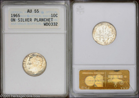 1965 10C Roosevelt Dime--Struck on a Silver Planchet--AU55 ANACS. The clad 1965 Dime was struck at the same time as the silver 1964-dated Dimes, partly to use up remaining silver planchets, and partly to discourage contemporary hoarding of silver coinage. We don’t know which facility this piece was struck at, since mintmarks were not placed on the 1965 dies, but the silver composition can be verified by the edge, obscured in this case by the ANACS holder. This mostly lustrous example has hints of gold and lilac toning.