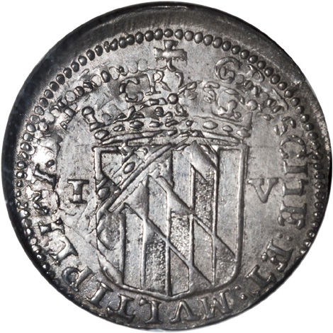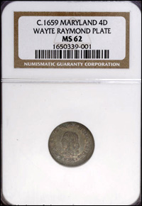 Not only is this remarkable example important because of its condition, but also because it is fully double struck, with evidence clearly visible on both sides. The first strike was several degrees off center, and rotated with respect to the second strike. We cannot be certain whether this is the finest known Maryland Groat or not, but it is certainly well in the Condition Census. It is also important as the Wayte Raymond Plate Coin, per the NGC holder. The surfaces are smooth and satiny with rich grayish-silver color accented by peripheral iridescent toning. Cecil Calvert had his coins made in London sometime in 1659, and transported them to Maryland at the time they were produced. Different sources have placed the actual time of minting between 1658 and 1660. Older records suggest that his subsequent arrest was due to the appearance of his portrait on the coins, but it is now understood that his arrest was actually due to the production and exportation of his own coinage from Europe to colonial America.(#32)