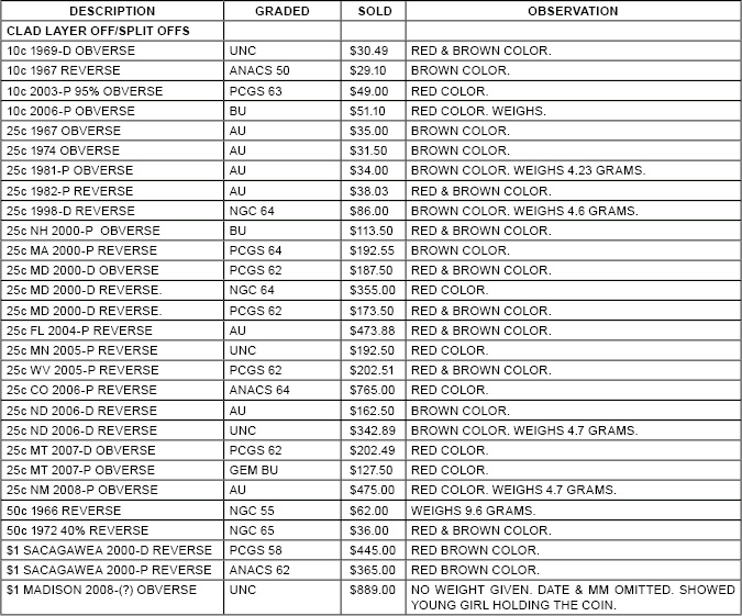 Below are records of recent sales of clad layer split-off mint errors on eBay from 07/01/08 to 09/30/08.