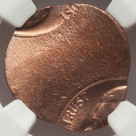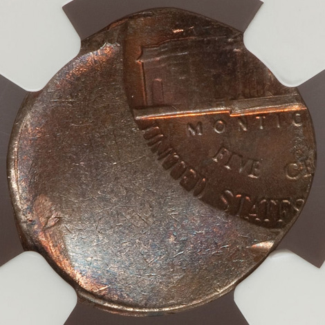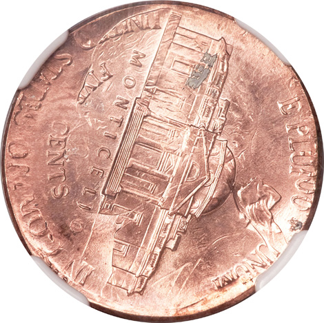 Undated Jefferson Nickel--Struck 50% Off Center on a Defective Cent Planchet--MS63 Red and Brown NGC