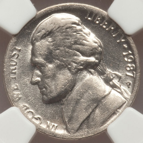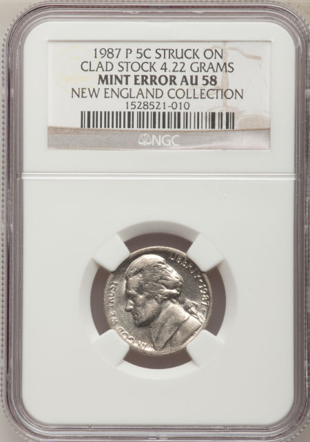 1987-P 5C Jefferson Nickel--Struck on Clad Stock--AU58 NGC