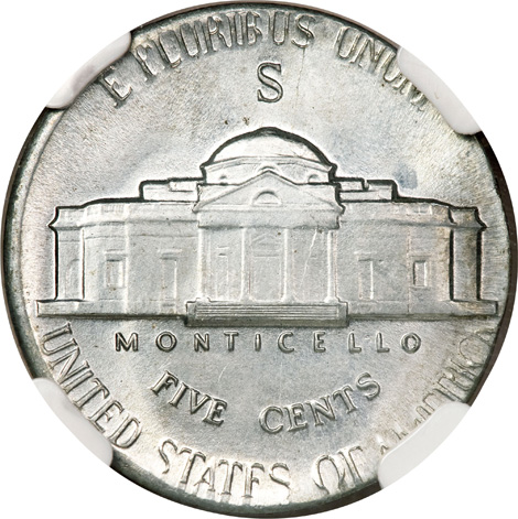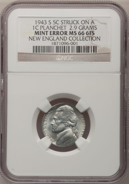 1943-S 5C Jefferson Nickel--Struck on a Steel Cent Planchet--MS66 Six Full Steps NGC
