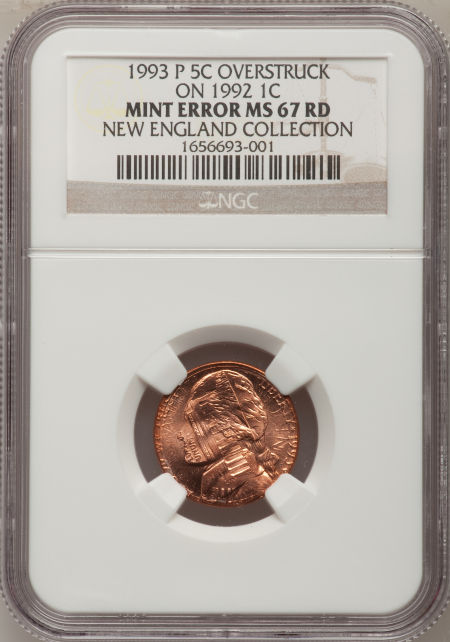 1993-P Jefferson Nickel--Struck over 1992 Lincoln Cent--MS67 Red NGC
